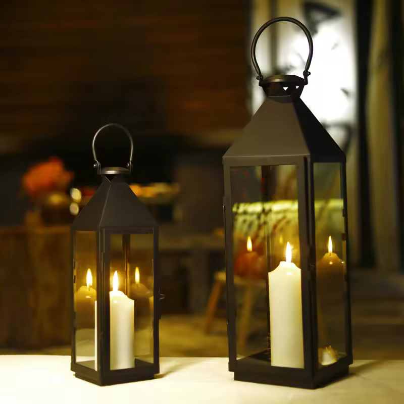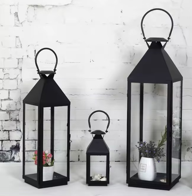 An elegant black metal and glass lanterns (Set of 3). Perfect to add a warm glow into your living space as a mantlepiece accessory or home decor piece. Suitable for only occasional outdoor use as a summer garden accessory.