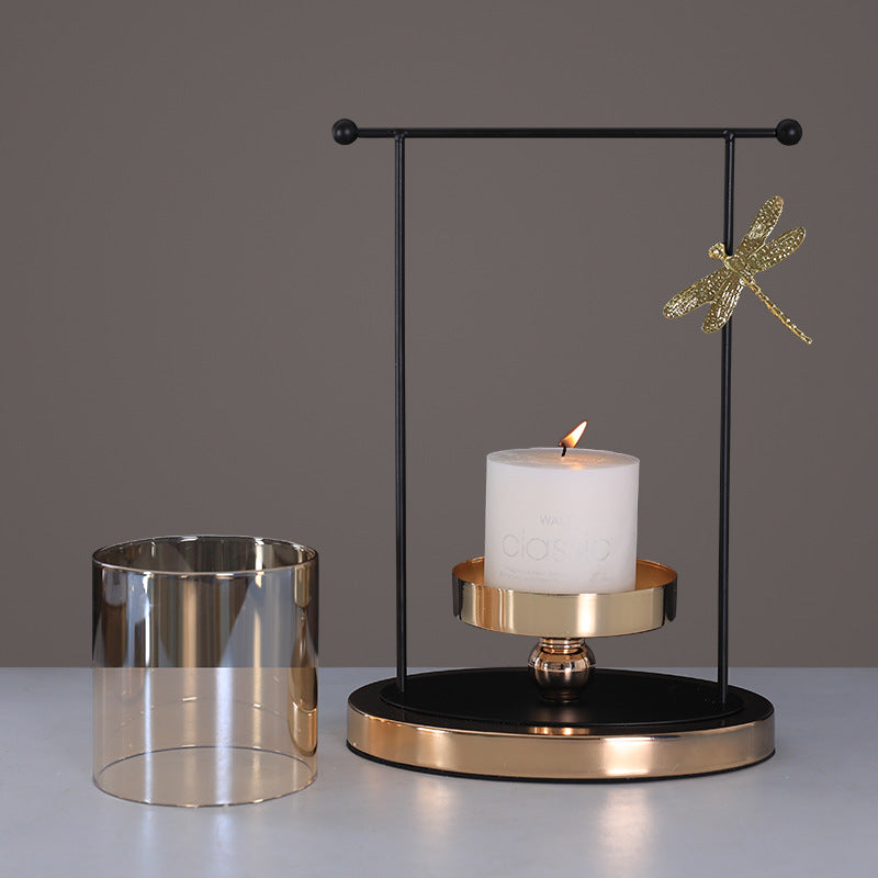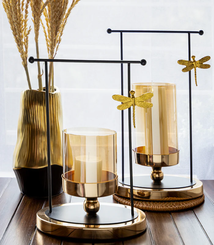 Crafted in Metal in gold and black the dragonfly candleholder holds a tinted glass hurricane for your candle. A Cast metal gold finish dragonfly perched on the side adds an element of fun & luxury to the piece
