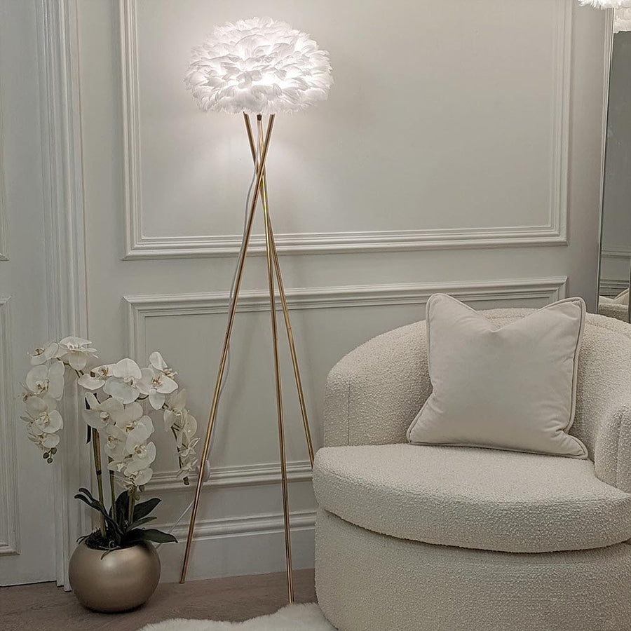 Add a dreamy touch to your home with the Sara Gold Tripod Feather Floor Lamp.